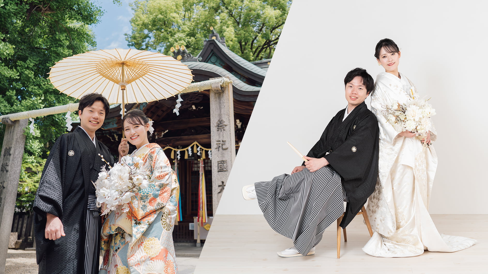 神社とスタジオで新婦さまは白無垢・色打掛それぞれ1着ずつ、合計2着で撮影ができる特別プラン。